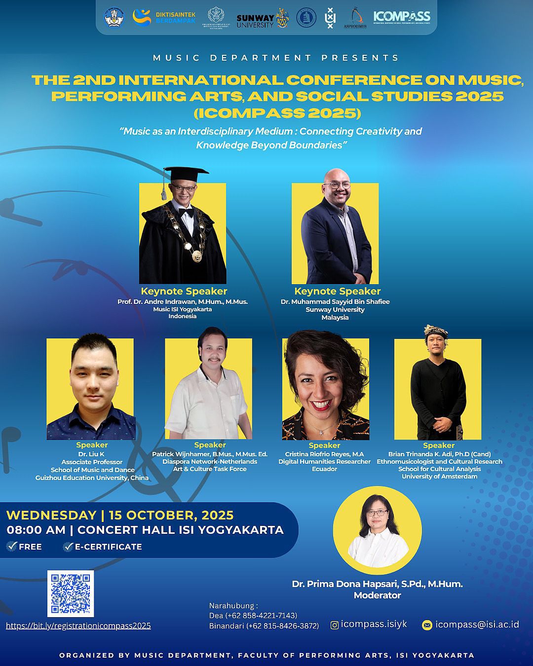 Yogyakarta, 15 Oktober 2025 — Institut Seni Indonesia (ISI) Yogyakarta kembali menghadirkan ajang akademik berskala internasional melalui The 2nd International Conference on Music, Performing Arts, and Social Studies (ICOMPASS 2025).