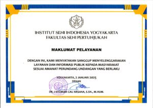 Fakultas Seni Pertunjukan berkomitmen untuk memberikan pelayanan publik yang transparan, akuntabel, dan profesional. Maklumat Pelayanan ini adalah janji kami kepada